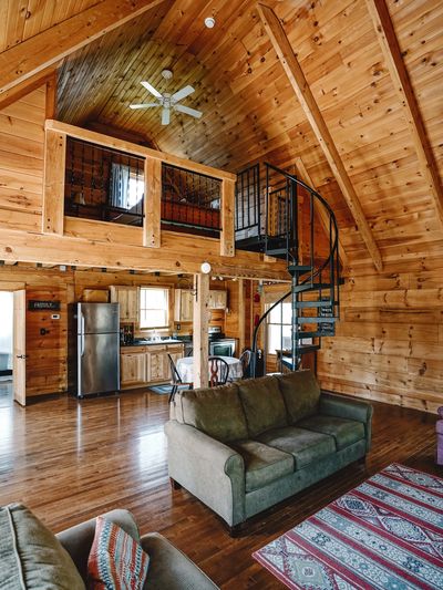 Loft Style Cabin with spiral staircase to loft and main sleeping quarters